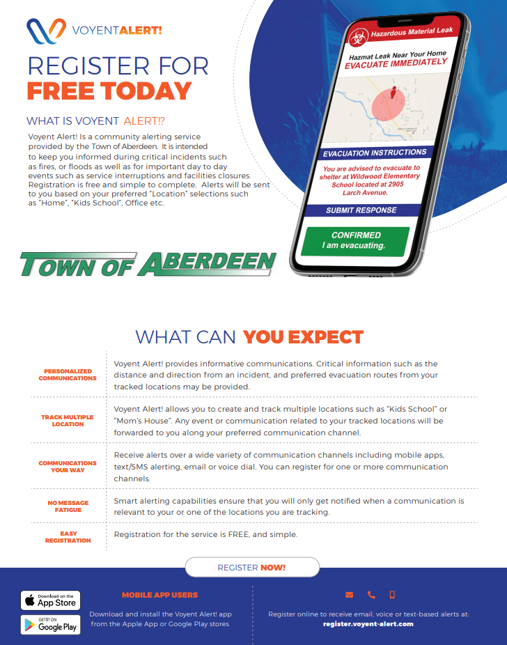 The Town Council of Aberdeen has invested in a Community Notification service that will advise you of Emergency Alerts, such as Boil Water Advisories, etc., and various Public Notifications to keep you informed and engaged in our community. To sign up go to register.voyent-alert.com. You can receive notifications by text, email or voice call. There is a tutorial to watch and sign up is simple. If you don't have a cell phone or internet access you can still set up notifications to your landline with the help of a family member or friend. We are requesting that all town residents register for this service so we can help each other stay safe. "Test" alerts will be issued in the upcoming months once we have the majority of users signed up. Please call the Town Office should you have any questions, (306)253-4311.